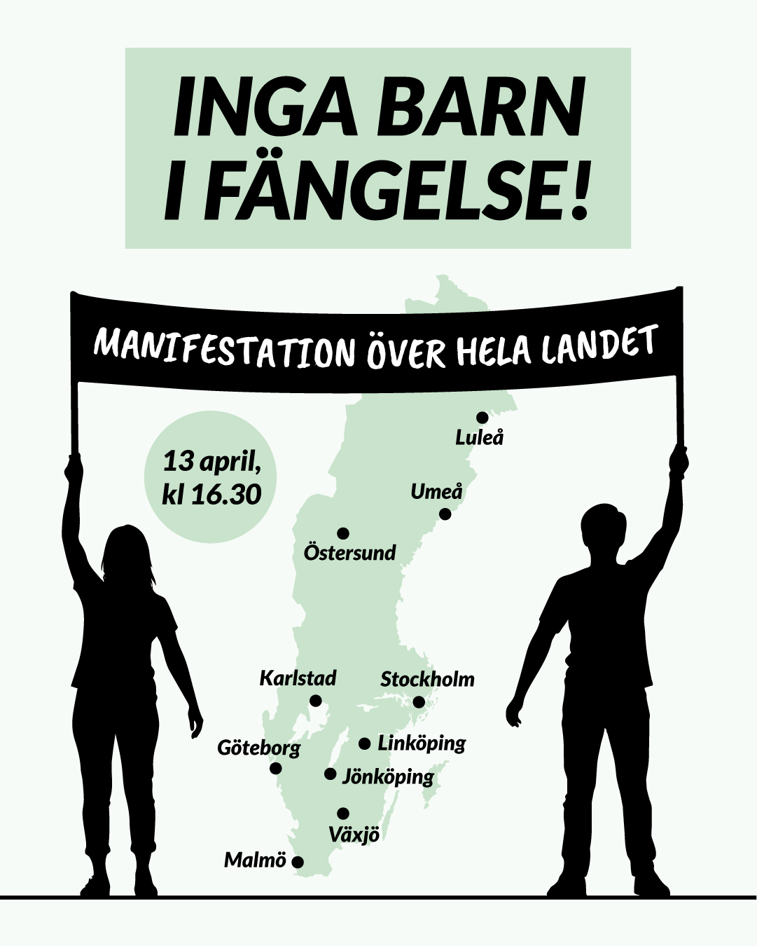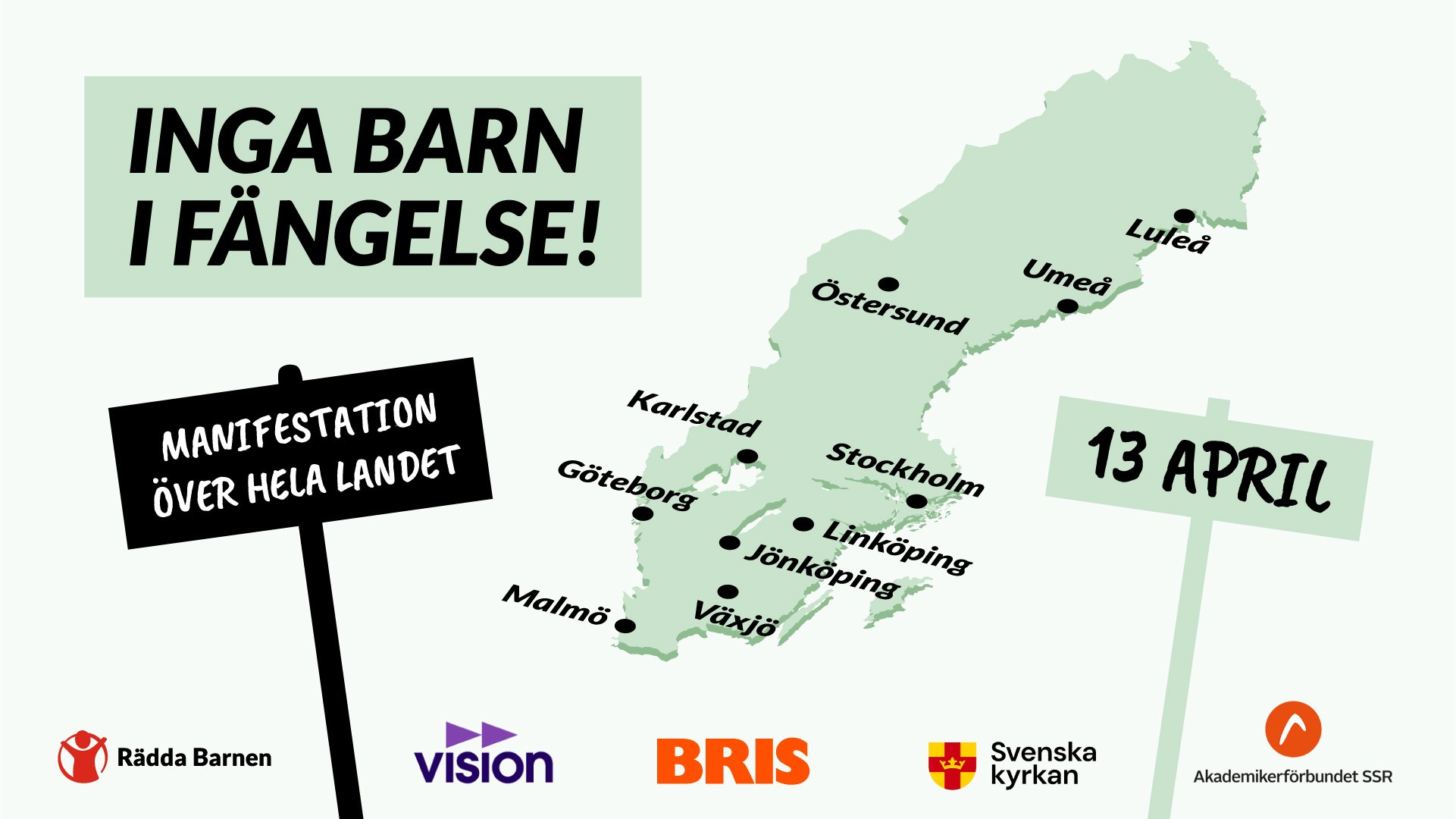 Rädda Barnen, Bris, Svenska kyrkan, Vision och Akademikerförbundet SSR står bakom att organisera samlandet av tusentals människor den 13 april genom parallella manifestationer över hela Sverige från norr till söder. Lokala manifestationer kommer att arrangeras i Umeå, Luleå, Östersund, Karlstad, Stockholm, Linköping, Göteborg, Växjö, Jönköping, Malmö och Uppsala. Nationella och lokala organisationer ansluter sig löpande – med ett gemensamt budskap: barn ska inte sitta i fängelse.